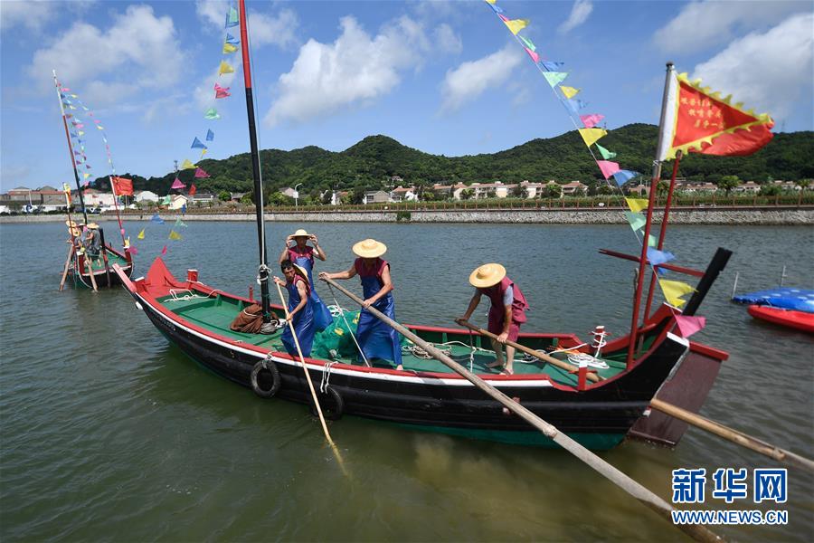 8月1日,螞蟻島居民在避風(fēng)塘漁民勞作現(xiàn)場(chǎng)體驗(yàn)區(qū)為游客表演木帆船捕魚(yú)。新華社記者黃宗治攝