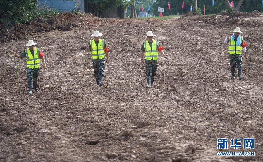 8月5日,夏德勤(右一)與同事在長(zhǎng)江武金堤背水面巡查管涌情況。新華社記者肖藝九攝