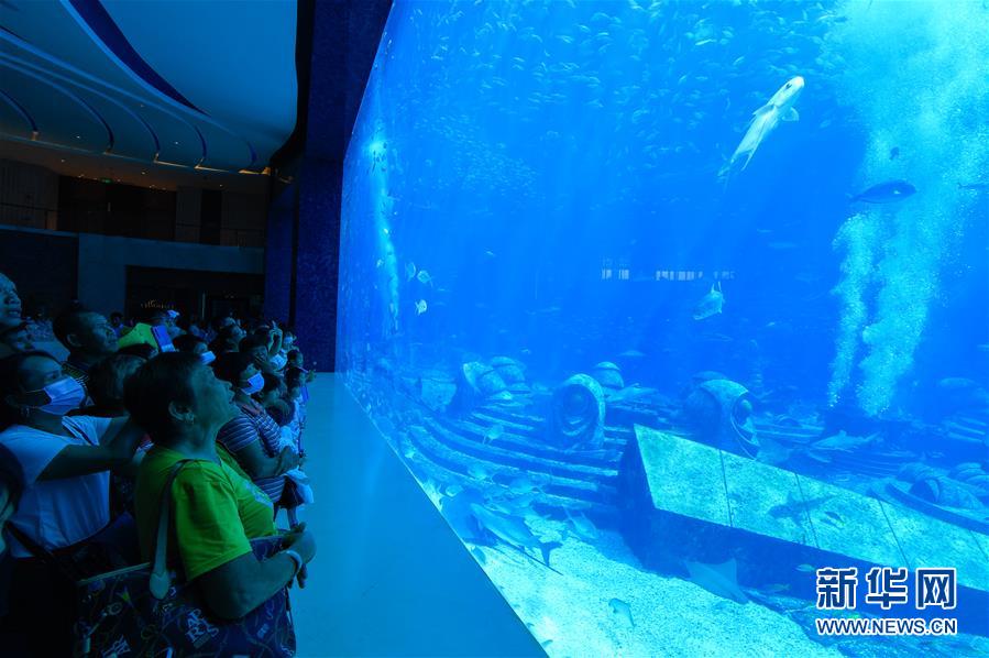 8月6日,游客在三亞亞特蘭蒂斯酒店內(nèi)的水族館游玩。新華社記者楊冠宇攝