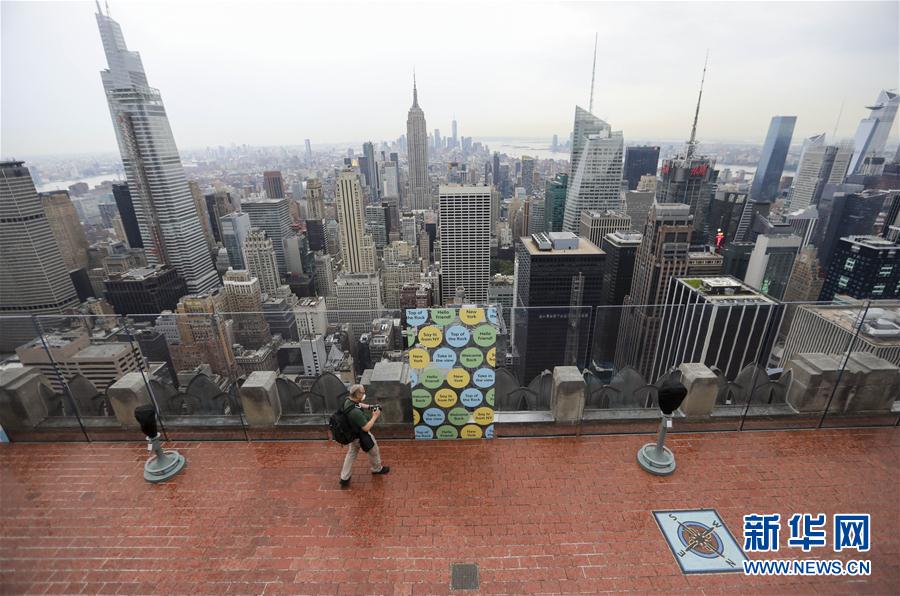 8月6日,在美國紐約,一名攝影師在洛克菲勒中心觀景臺上參觀。當(dāng)日,3月份暫時(shí)關(guān)閉的洛克菲勒中心觀景臺恢復(fù)對公眾開放。每天13時(shí)至21時(shí),人們可戴口罩前往參觀。新華社記者王迎攝