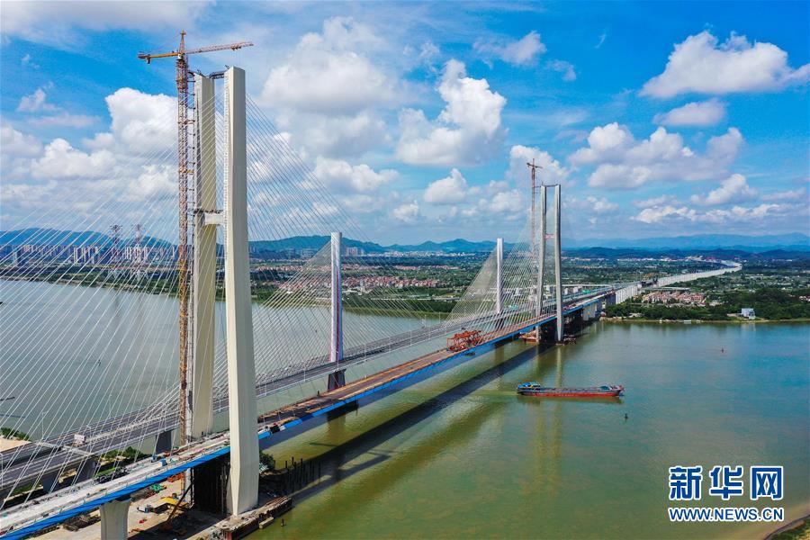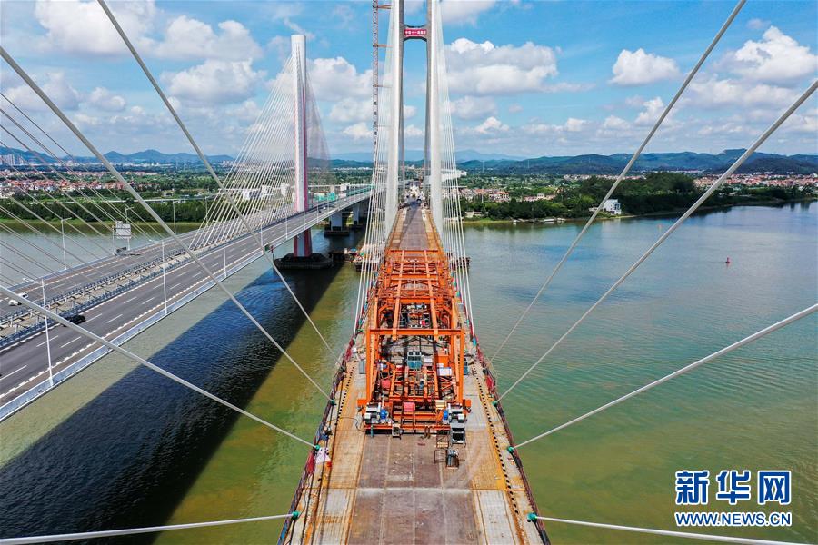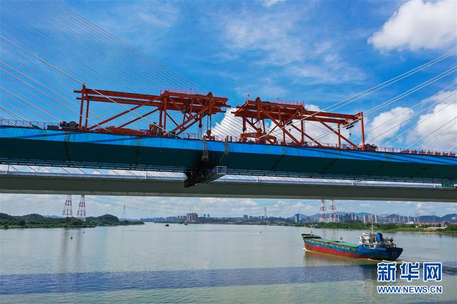 8月9日拍攝的廣州南沙港鐵路跨西江特大斜拉橋最后一塊鋼箱梁吊裝施工現(xiàn)場(無人機(jī)照片)。當(dāng)日,中鐵十一局承建的粵港澳大灣區(qū)基礎(chǔ)設(shè)施“硬聯(lián)通”重點工程——廣州南沙港鐵路跨西江特大斜拉橋完成最后一塊鋼箱梁吊裝作業(yè),大橋即將合龍。該橋位于廣東佛山市和江門市交界處,全長1117.5米。新華社記者劉大偉攝。