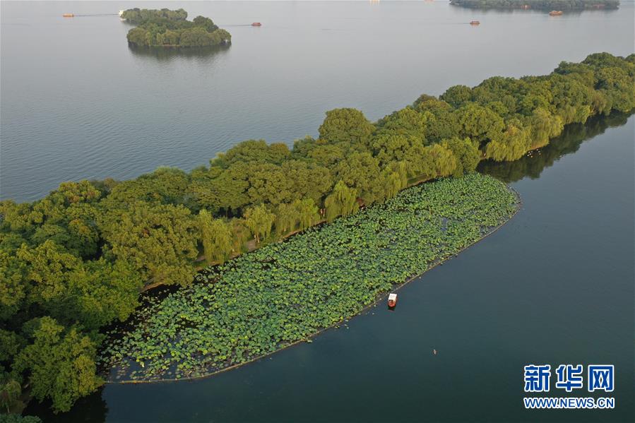 游客在西湖景區(qū)蘇堤附近觀賞荷花(6月30日攝,無人機(jī)照片)。新華社記者黃宗治攝。