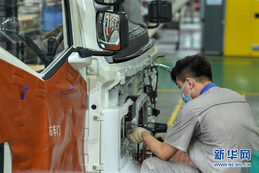 8月10日,在位于長春市的一汽解放總裝車間,工人在裝配車輛。中國第一汽車集團有限公司7月銷售整車32.2萬輛,同比增長23.2%,延續(xù)上半年的增長態(tài)勢。新華社記者張楠攝。