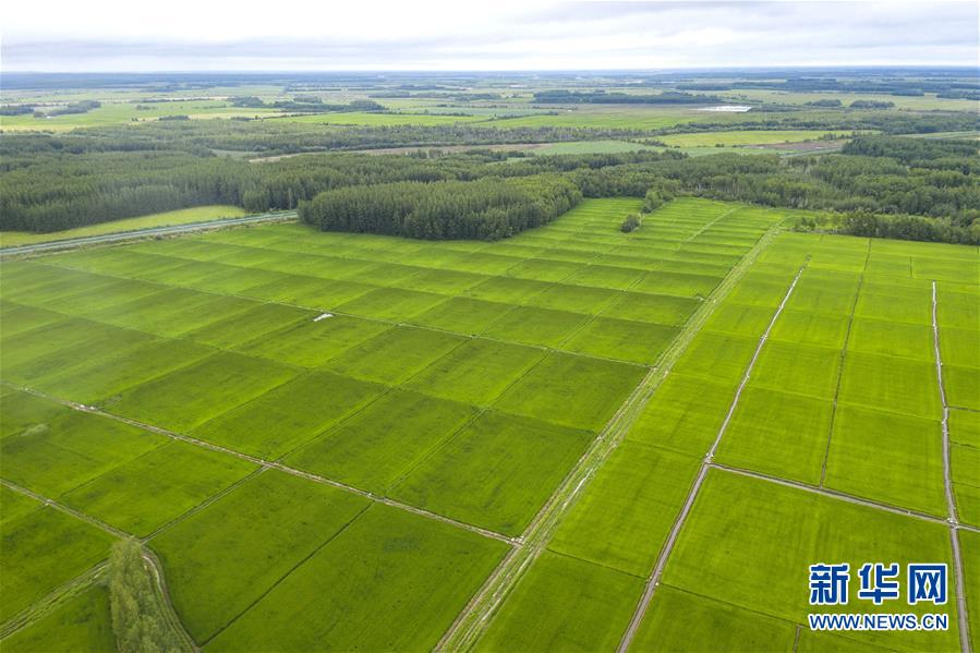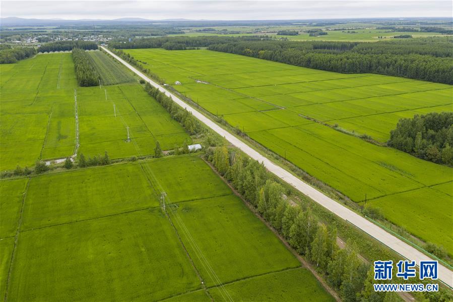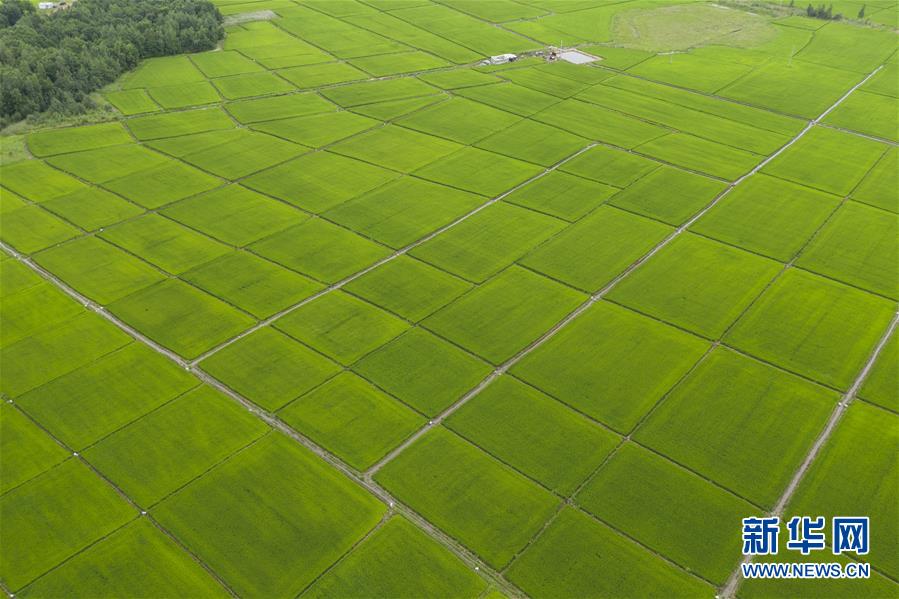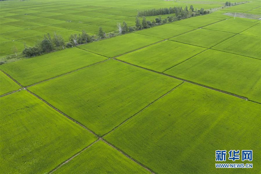 8月11日在撫遠(yuǎn)市拍攝的稻田(無(wú)人機(jī)照片)。時(shí)下,“華夏東極”黑龍江省撫遠(yuǎn)市的水稻長(zhǎng)勢(shì)良好,蒼翠的稻田一望無(wú)際,猶如綠毯鋪在大地上。新華社記者謝劍飛攝。