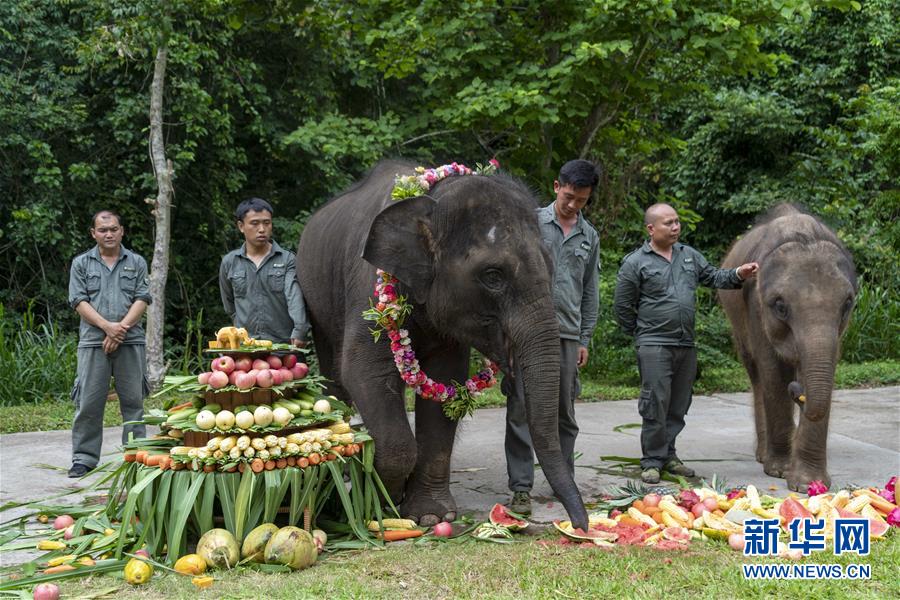 8月12日,在西雙版納傣族自治州亞洲象種源繁育及救助中心,救助象“羊妞”在自己的生日會上。新華社記者 陳欣波 攝