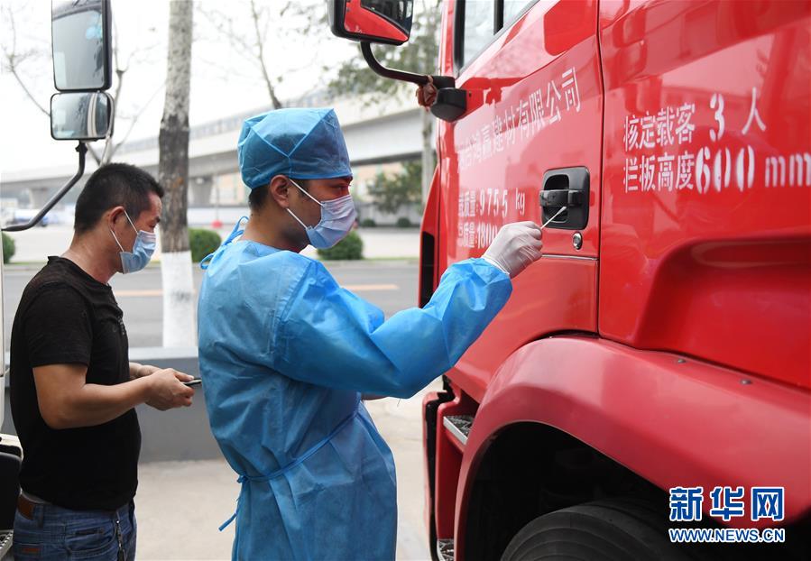工作人員在新發(fā)地批發(fā)市場周轉(zhuǎn)新區(qū)對進(jìn)場車輛進(jìn)行取樣(8月6日攝)。 新華社記者 張晨霖 攝