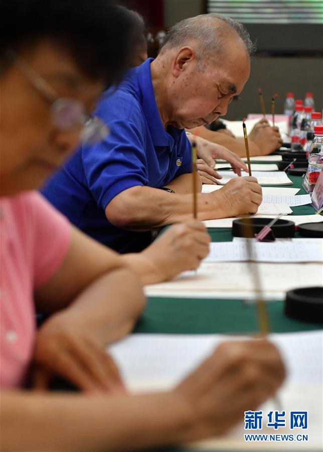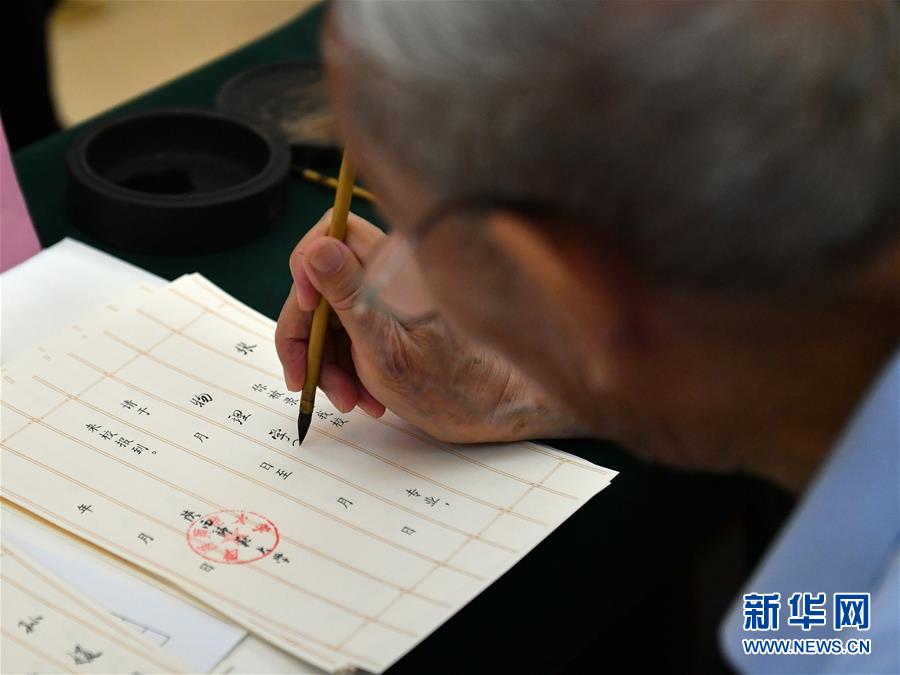 8月13日,陜西師范大學退休教師郭祖儀(右)書寫錄取通知書。當日,陜西師范大學2020年手寫錄取通知書正式開筆。該校自2007年起采用毛筆書寫錄取通知書的方式,為新生傳遞佳音。今年,學校十余位退休教師、在職教師、校友代表等書法愛好者將為約4500名新錄取的本科生送上帶著墨香的大學錄取通知書。新華社記者張博文攝