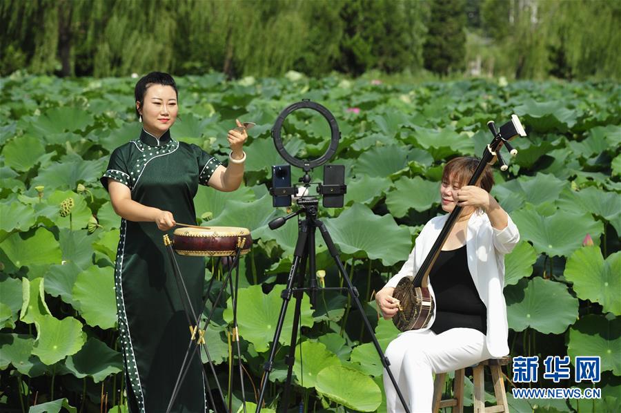 8月13日,河北省河間市西河大鼓非遺項目藝人李雪(左)、張領(lǐng)娣通過網(wǎng)絡直播表演西河大鼓。暑假期間,河北省河間市文化館推出非遺展演“云端”播系列活動,組織當?shù)匚骱哟蠊姆沁z項目傳承人利用視頻直播的方式進行線上展演,通過“云端”傳承非遺文化。新華社記者朱旭東攝