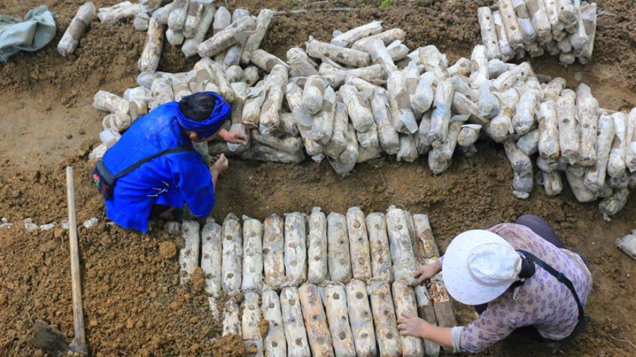 在黔西南州興義市灑金街道林下菌藥產(chǎn)業(yè)種植基地,易地扶貧搬遷群眾正在放置菌棒。