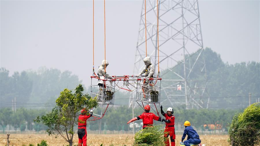6月18日,直升機(jī)用吊籃把兩名檢修人員“吊”到有缺陷的特高壓線路上。