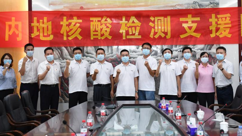 來自廣東省各醫(yī)院的內(nèi)地核酸檢測支援隊的7名先遣隊隊員在深圳灣口岸出發(fā)前和送行人員合影(8月2日攝)。