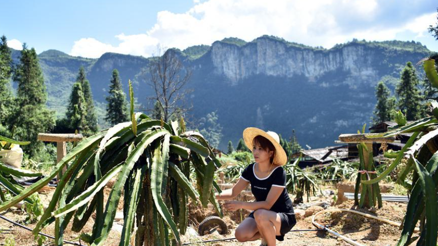 8月3日,在碗米坡鎮(zhèn)首八峒村,種植基地負責人易潤菊采摘成熟的火龍果。