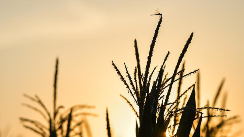 在吉林省梨樹縣國家百萬畝綠色食品原料(玉米)標準化生產(chǎn)基地核心示范區(qū),一只蜻蜓??吭谝恢暧衩咨希?月23日攝)。