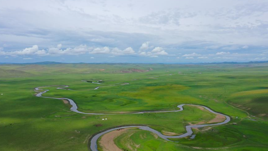 這是在呼倫貝爾陳巴爾虎旗牧云山頂拍攝的莫日格勒河(8月3日攝,無人機照片)。