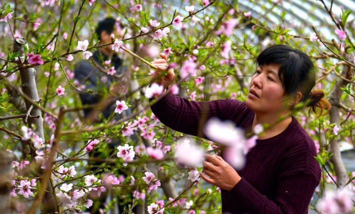 隨著氣溫升高,河北省邯鄲市邯山區(qū)碩果春農(nóng)業(yè)園大棚內(nèi)的桃花競相綻放。