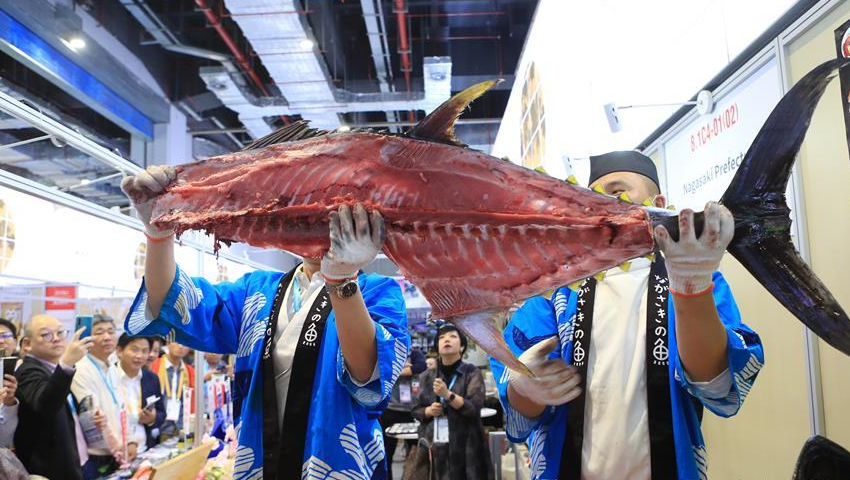 11月7日,來自日本長崎魚市株式會(huì)社的專業(yè)切魚師傅現(xiàn)場(chǎng)解體一條70公斤的藍(lán)鰭金槍魚,吸引大量參觀者觀看、品嘗。