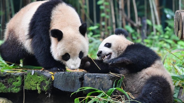 正在享受竹子大餐的廣州長隆野生動(dòng)物世界大熊貓婷仔被大熊貓隆仔搶食,兩只大熊貓上演一場爭食戲碼。