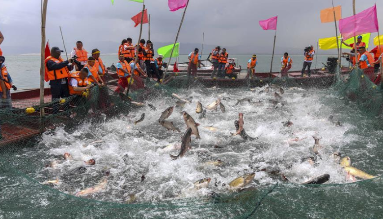 2019年7月9日,漁民們?cè)诮K連云港沿海地區(qū)海邊的灘涂上將剛收獲的海蟶運(yùn)送上岸裝箱外運(yùn)。