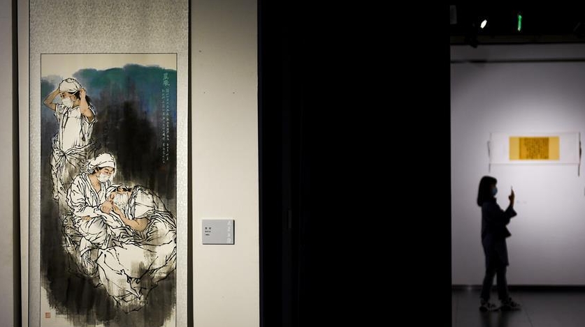 7月11日,觀眾在吉林省抗疫主題美術(shù)·攝影作品展上參觀。展覽共展出抗擊新冠肺炎疫情主題書法、國(guó)畫、油畫、攝影等作品367件(組)。
