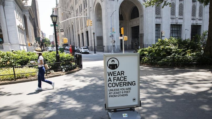 7月6日,行人走過(guò)美國(guó)紐約一處公園內(nèi)的提示牌,上面寫(xiě)有防疫須知和公園管理規(guī)定。