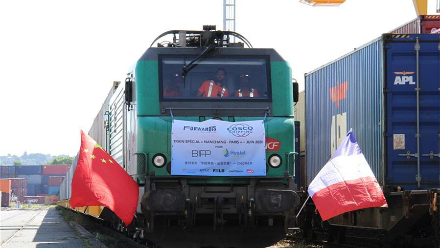 6月23日,滿載防疫物資的中歐班列抵達法國巴黎東南郊的瓦朗通。
