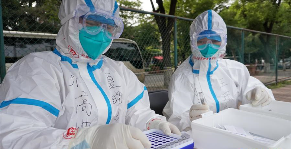 6月15日,北京市豐臺區(qū)東高地街道采樣點(diǎn)工作人員在進(jìn)行采樣工作。