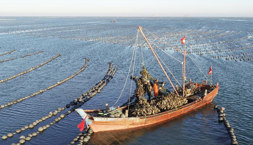 當日,在遼寧省大連市長海縣廣鹿島海域,漁民忙碌地打撈牡蠣,呈現(xiàn)一片繁忙的豐收景象。