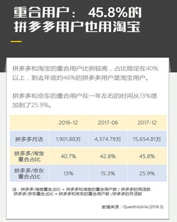 從用戶分布來看,據(jù)企鵝智酷發(fā)布了《拼多多用戶研究報(bào)告》,拼多多的一線城市用戶,實(shí)際上只比淘寶低了2個(gè)百分點(diǎn);2017年底,有46%的拼多多用戶同時(shí)也是淘寶用戶,是所有電商平臺(tái)中最高的;拼多多和京東的重合用戶,一年內(nèi)增長了一倍。