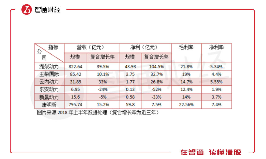 國內(nèi)的發(fā)動機供應市場高度集中,前十大供應占據(jù)了超過7成的份額,主要為柴油機供應,適用于商用車,龍頭濰柴動力(02338)市場份額最大。汽油機適用于乘用車,由于主要為內(nèi)供,市場數(shù)據(jù)較少。與國際龍頭康明斯相比,上半年國內(nèi)的柴油機企業(yè)賺錢能力還是較低的。