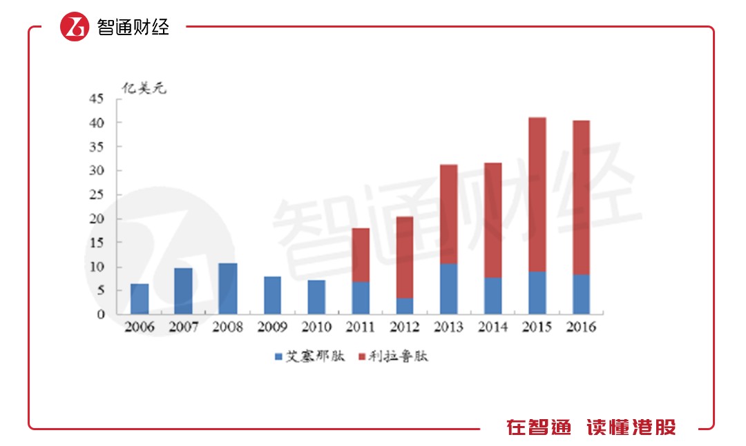 從2005年發(fā)展至今,全球已有6種GLP-1受體激動劑相繼獲批上市,整個(gè)GLP-1受體激動劑類藥物的全球市場規(guī)模已超過40億美元,2011-2016年的復(fù)合增長率超過15%。而艾塞那肽作為最早上市的GLP-1類似物,上市后銷售額快速增長,早在2008年就突破10億美元。