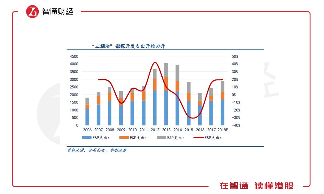 智通財(cái)經(jīng)APP了解到,4年的行業(yè)低迷期,中石油、中石化、中海油合計(jì)用于勘探、開發(fā)的資本支出從2014年的3954億元人民幣(單位下同),下降至2016年的2112億元,“三桶油”國內(nèi)原油產(chǎn)量也從2014年的13.63億桶下降至2017年的12.50億桶。
