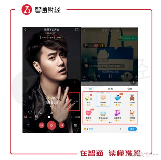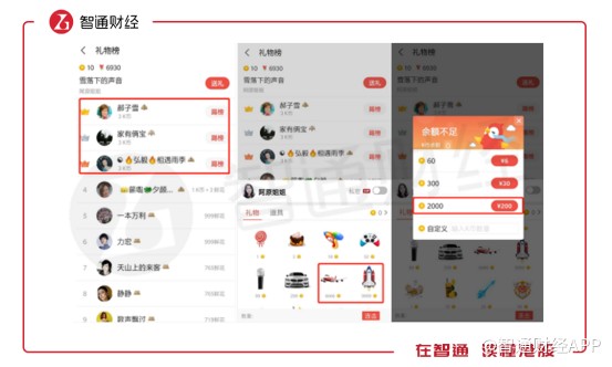 在用戶進(jìn)入K歌界面后,除了K歌按鍵還有就是歌曲榜單,這些榜單記錄的是該歌曲翻唱獲得禮物數(shù)的排行情況。翻唱歌手被打賞的禮物越多,榜單排名越高,禮物則是靠用戶通過(guò)現(xiàn)金兌換而來(lái)。與直播打賞類(lèi)似,全民K歌也是通過(guò)用戶購(gòu)買(mǎi)虛擬禮物進(jìn)行變現(xiàn)。