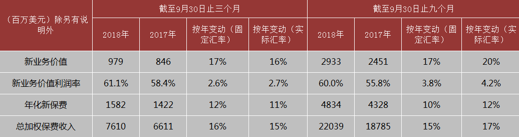 11月9日,友邦保險(xiǎn)控股有限公司(1299)公布截至2018年9月30日止第三財(cái)季業(yè)績顯示,報(bào)告期內(nèi),按固定匯率計(jì)算,公司新業(yè)務(wù)價(jià)值增長17%至9.79億美元,年化新保費(fèi)上升12%至15.82億美元,新業(yè)務(wù)價(jià)值利潤率增加2.6個(gè)百分點(diǎn)至61.1%,總加權(quán)保費(fèi)收入上升16%至76.10億美元。
