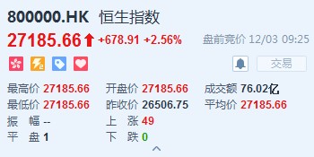 智通財經APP獲悉,周日市場傳來好消息,G20峰會上中美元首在貿易摩擦議題上,中美雙方取得了積極進展,對股市來說是一個極大的利好,短期內市場投資氛圍會得到改善。恒生指數開盤漲2.56%,報27185.66點。國企指數漲3.05%,報10945.67點。紅籌指數漲2.29%,報4437.84點。大市盤前成交76.02億港元。