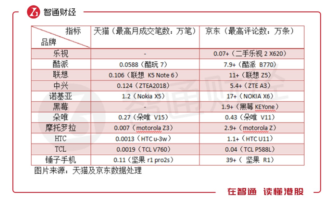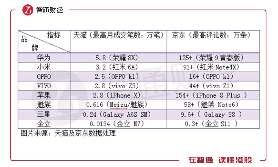 電商的崛起讓手機多了一條網絡強大的銷售渠道,目前天貓和京東是電商平臺中的兩大巨頭,國內的最終商品基本在這兩大平臺售賣。智通財經APP通過天貓及京東相對應的月成交筆數(shù)及評論數(shù)了解不同品牌的智能手機售賣情況。