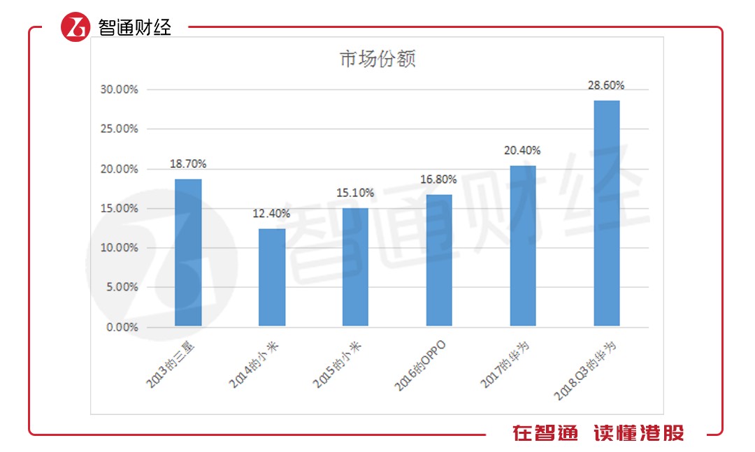 以下為從2013年市場中國手機市場最大市場份額變遷:
