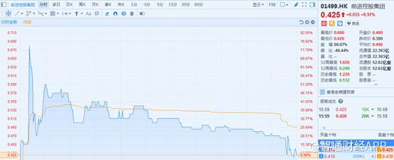 智通財經APP獲悉,1月10日停牌的前進控股集團(01499)于24日復牌,股市反響劇烈,開盤十分鐘曾一度暴漲74.56%,不過隨后不斷滑落,截止16時45分,報港元0.425元(下同),較停牌日收盤價0.39元僅有9%的增幅。