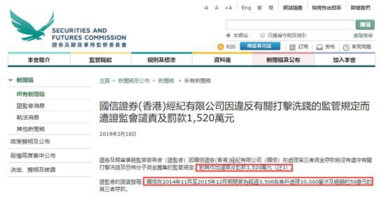 香港證監(jiān)會調查發(fā)現,國信證券在2014年11月至2015年12月期間曾為超過3500名客戶處理10000筆涉及總額約50億港元的第三者存款。監(jiān)管特別指出,國信于為期14個月的期間,處理了超過2200筆可疑的第三者存款,涉及總額超過23億港元。