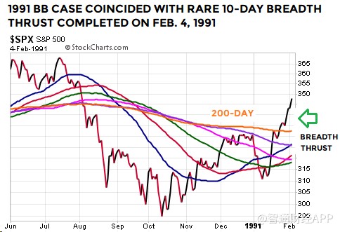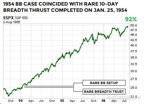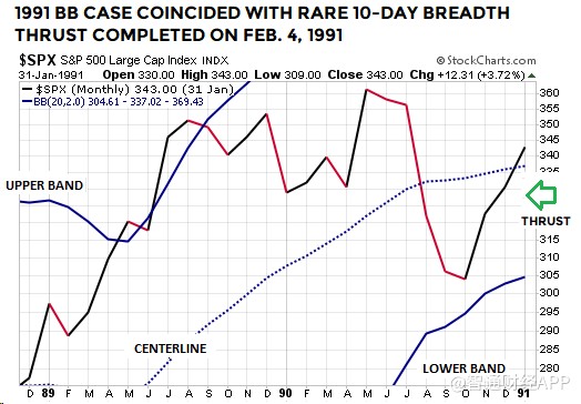 上述布林通道技術(shù)形態(tài)屬較為罕見(jiàn)的類(lèi)型。值得注意的是,1954年和1991年時(shí)的另一技術(shù)指標(biāo),廣量沖力指標(biāo),基本上與2019年1月21日出現(xiàn)的廣量沖力指標(biāo)形態(tài)類(lèi)似。因此,在1954年、1991年和2019年,標(biāo)普500指數(shù)走出了布林通道及廣量沖力指標(biāo)都相似的技術(shù)形態(tài)。