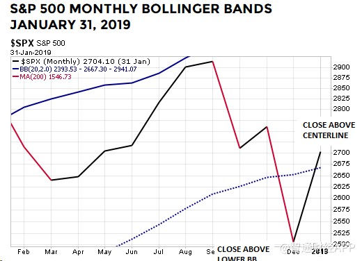 下圖顯示了標(biāo)普500指數(shù)1月31日收于布林通道月線中軌上方。標(biāo)普500指數(shù)在12月收于中軌以下,但在1月份便開(kāi)始反彈,并成功回到中軌以上: