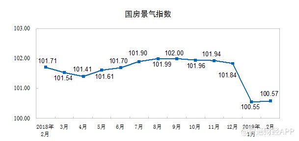 2月份,房地產(chǎn)開(kāi)發(fā)景氣指數(shù)(簡(jiǎn)稱(chēng)“國(guó)房景氣指數(shù)”)為100.57,比2018年12月份回落1.27點(diǎn)。