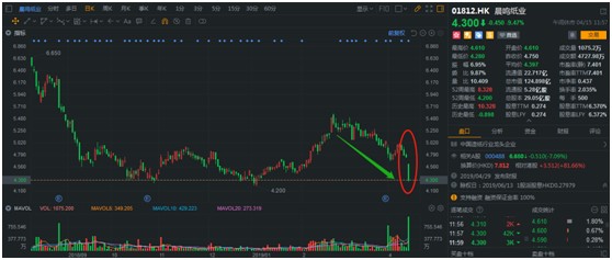 近日,大龍頭紙企晨鳴紙業(yè)(01812)發(fā)布2019年一季度業(yè)績(jī)預(yù)告,同比94.25%-96.17%的下滑,直接讓已經(jīng)近30多個(gè)交易日不斷下跌的股價(jià),再度迎來大跌。截止4月15日早盤,晨鳴紙業(yè)大跌9.47%,僅半日交易量、成交額達(dá)到1075萬(wàn)股、4728萬(wàn)港元,是前一整日交易量的近9.5倍。