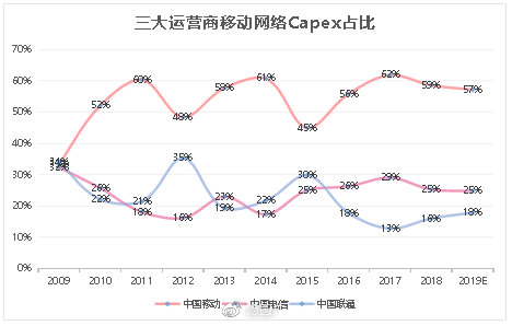 過去十年,中國移動占比三大運(yùn)營商總資本開支的范圍基本處于50%-60%區(qū)間,電信占比20-30%,聯(lián)通15%-30%。