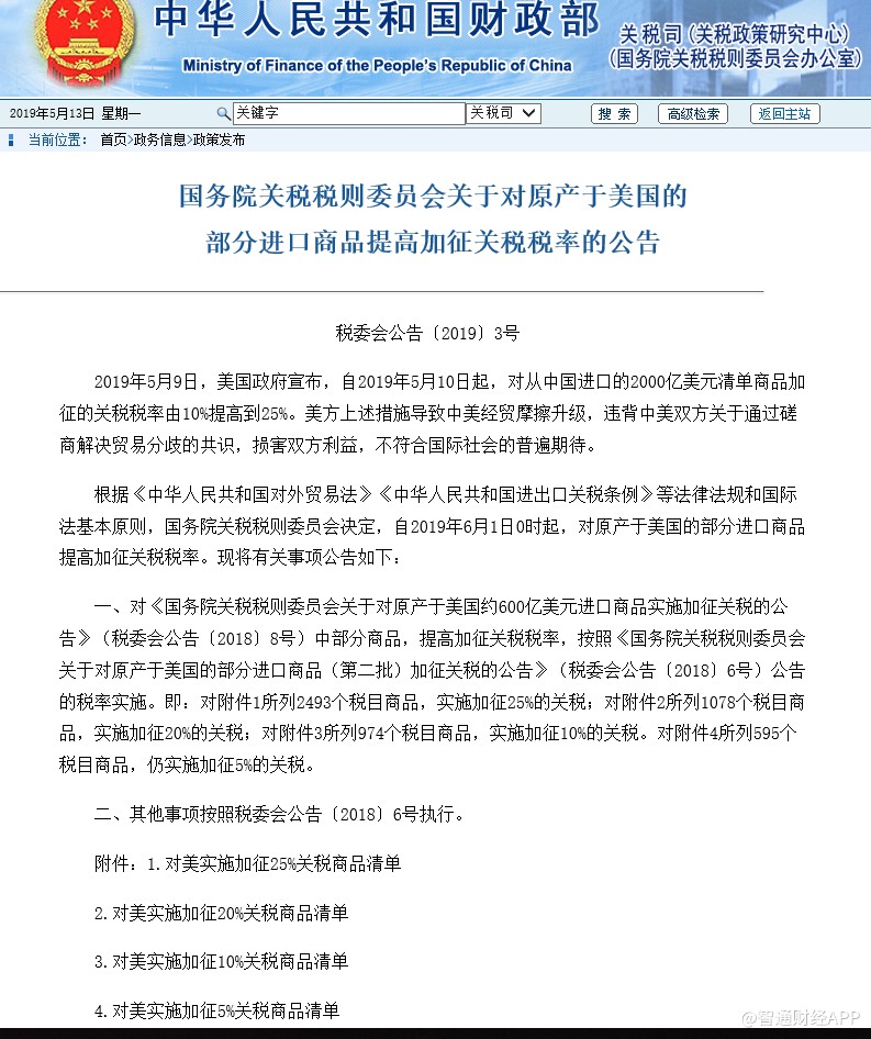 智通財(cái)經(jīng)APP獲悉,據(jù)財(cái)政部官網(wǎng)消息,2019年5月9日,美國政府宣布,自2019年5月10日起,對從中國進(jìn)口的2000億美元清單商品加征的關(guān)稅稅率由10%提高到25%。美方上述措施導(dǎo)致中美經(jīng)貿(mào)摩擦升級,違背中美雙方關(guān)于通過磋商解決貿(mào)易分歧的共識(shí),損害雙方利益,不符合國際社會(huì)的普遍期待。