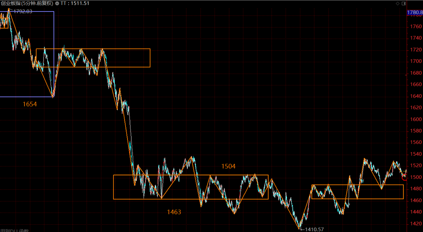 創(chuàng)業(yè)板這里未拉離最后一個(gè)30分鐘中樞(1463-1504),在中樞上軌附近橫盤,這里做同級(jí)別分解后,紅圈圈位置為五分鐘級(jí)別的第三類買點(diǎn)。因此,綜合兩個(gè)股指,周初市場(chǎng)上漲,后半段需轉(zhuǎn)入防守,逐步縮減倉位,以應(yīng)對(duì)回調(diào)。