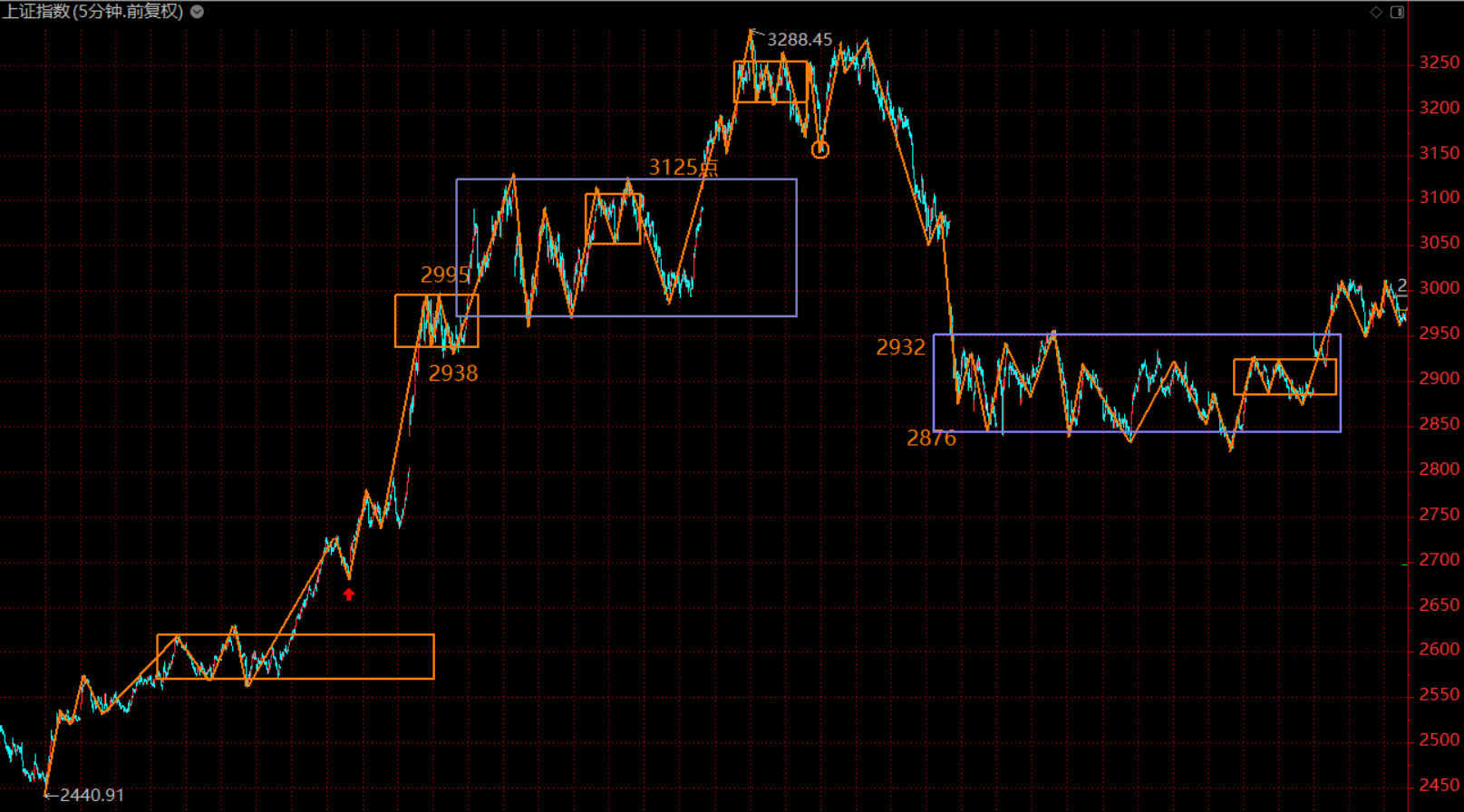 下圖為上證指數(shù)五分鐘級(jí)別走勢(shì)結(jié)構(gòu)。從走勢(shì)結(jié)構(gòu)上看,這里走出標(biāo)準(zhǔn)30分鐘級(jí)別第三類買點(diǎn),本周有望往上繼續(xù)拓展,甚至回補(bǔ)3050點(diǎn)缺口。同時(shí),我們也關(guān)注到,這個(gè)位置形成了5分鐘上漲段的第二個(gè)中樞,本周的上漲很有可能會(huì)形成趨勢(shì)背馳。因此,本周的大方向應(yīng)該為持股待漲,越長(zhǎng)越賣。在滬指回補(bǔ)缺口過程中,完成降倉。