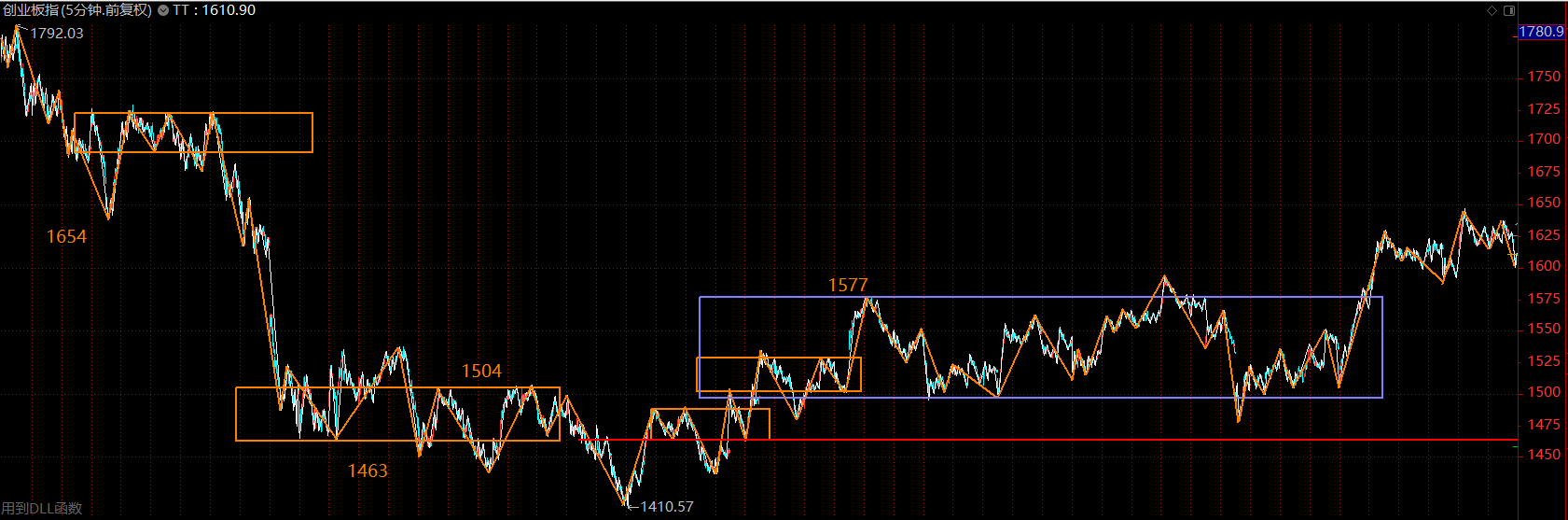 創(chuàng)業(yè)板指數(shù)依舊強(qiáng)勢(shì),這里在構(gòu)建30分鐘級(jí)別的三買,以1577點(diǎn)為界,如果回調(diào)不破,則這里將是創(chuàng)業(yè)板主升行情的起點(diǎn)。如若重新跌回中樞內(nèi)部,則按中樞震蕩處理。創(chuàng)業(yè)板走勢(shì)要強(qiáng)于主板很多,后續(xù)行情多半仍然圍繞創(chuàng)業(yè)板展開。