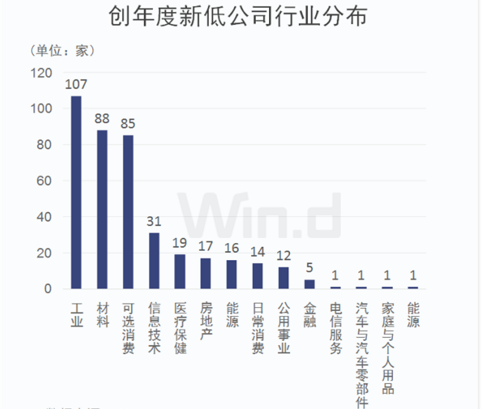Wind統(tǒng)計顯示,有395家公司近3日最低股價創(chuàng)今年以來新低。從相關(guān)公司行業(yè)分布來看,工業(yè)最多,有107家,材料和可選消費均有超過80家。可見,雖然股指整體上漲,但傳統(tǒng)工業(yè)、材料領(lǐng)域投資者普遍不太看好。