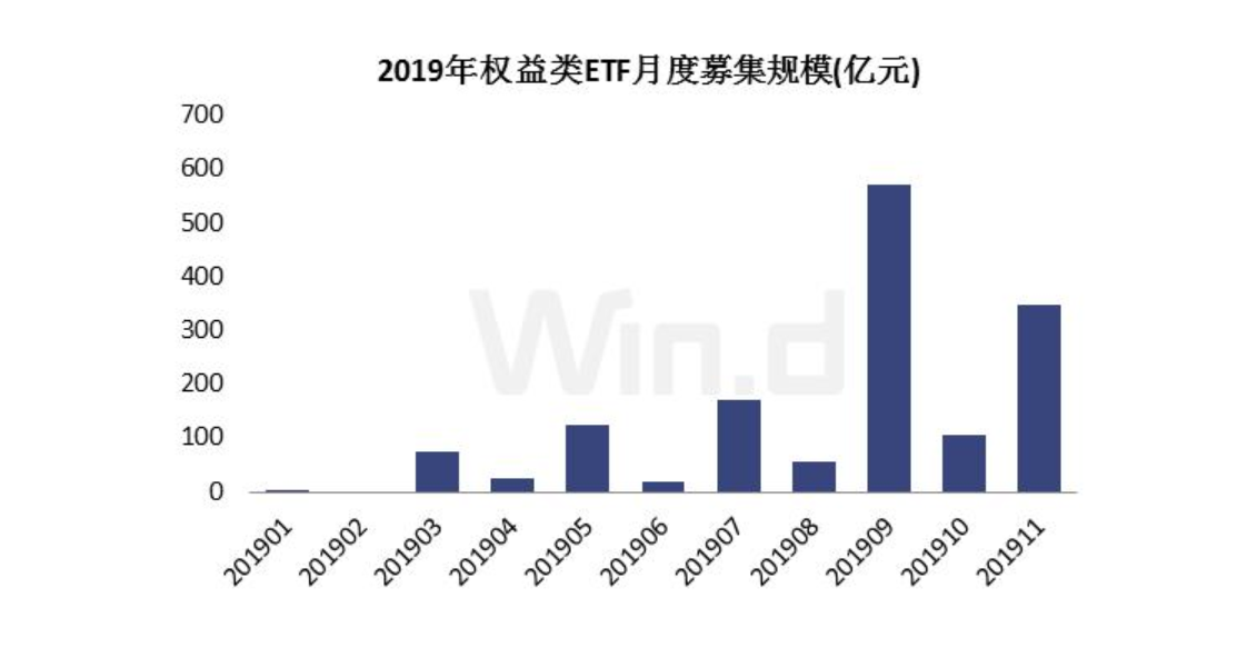 月度數(shù)據(jù)來(lái)看,今年9月權(quán)益類(lèi)ETF募集規(guī)模最大,達(dá)571.98億元;其次就是11月,目前11月尚未過(guò)半,權(quán)益類(lèi)ETF募集規(guī)模已達(dá)348.84億元。