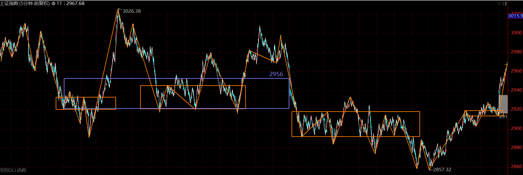 上周市場用前四天的時間,完成了這一輪五分鐘上漲趨勢的第一個中樞構(gòu)建,是一個奔走型的中樞,隨后在周五開始了主升階段。值得欣喜的是,市場終于在2956這個大關口放量了,并且一舉突破,預計在2956到3000點這40點的空間內(nèi),市場將會完成五分鐘上漲第二個中樞的構(gòu)建,并且橫盤將其擴展為30分鐘級別,時間周期大約是極點出現(xiàn)后的10到15個交易日。這將是投資者積極調(diào)倉換股,耐心布局年報行情的最佳時期。